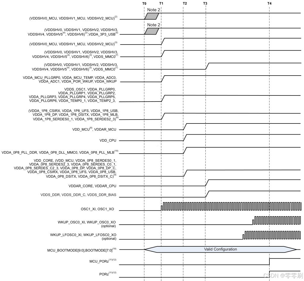 3. Any MCU or Main dual voltage IO supplies (VDDSHVn_MCU or VDDSHVn) being supplied by 1.8V tosupport 1.8V digital interfaces. When eMMC memories are used, Main 1.8V supplies could have delayed start times that aligns to T3 due to PDN designs grouping supplies with VDD_MMC0.