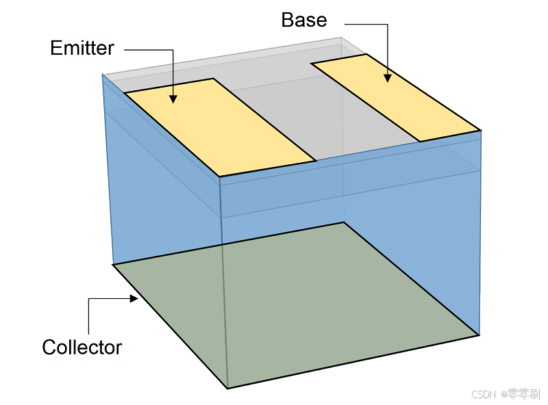 双极晶体管由三个交替的p型和n型掺杂区域组成。尽管有两种可能的掺杂结构,n-p-n 或 p-n-p,但本文我们将重点介绍 n-p-n 配置,因为这是最常见的一种结构。通过将 p 型层夹在两个 n 型层之间形成 n-p-n 结构。可以认为该器件具有三个不同的区域,分别称为发射极、基极和集电极。可以通过三个单独的金属触点分别对每个区域进行电寻址,这些触点根据它们所连接的区域进行标记。