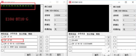 D)、节点开关灯控制,E104-BT10-G或者手机做代理节点控制。如E104-BT10-G发送指令09 c1 00 02 82 02 01 00 00 00,返回08 41 00 02 00 01 82 04 01可控制节点1开启灯光,09 c1 00 02 82 02 00 00 00 00,返回08 41 00 05 00 01 82 04 00可控制节点1关闭灯光。