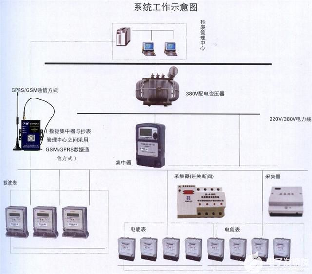 整个抄表系统分为两大部分:前端采集及传输部分、中心数据储存及处理展示部分;采集及传输:主要包括智能电表,无线DTU,设备防护箱等。主要通过DTU采集电表数据,并通过GPRS/3G/4G等无线网络将数据传输到数据中心;数据储存及处理展示:主要包括数据、应用、监控屏幕等部分组成。主要负责对前端采集返回的数据进行储存、分析、展示等操作。