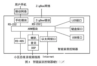 采用ARM架构的32位嵌入式RISC处理器和开源的嵌入式linux操作系统;是智能家居控制系统的控制中心,也是家居系统中信息家电平台的网关;遇盗抢或疾病,按紧急按钮,自动向管理中心报警;以家庭为单位配置,利用液晶屏显示小区通知、系统各部分工作状况及数据;利用ZigBee传感器节点监测各种故障报警数据(火灾、煤气泄漏等),并自动通过手机模块发给用户或小区管理中心;通过以太网(或RS - 485)与小区管理中心通信;通过控制器上的无线ZigBee模块与家居系统中各子节点进行通讯,对多种家电设备进行相应的控制;用户可通过Internet远程监控家庭中的多种家居设备。