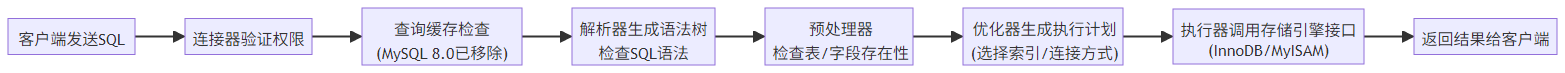 MySQL 执行 SQL 的内部流程可分为解析→优化→执行三个阶段,具体步骤如下: