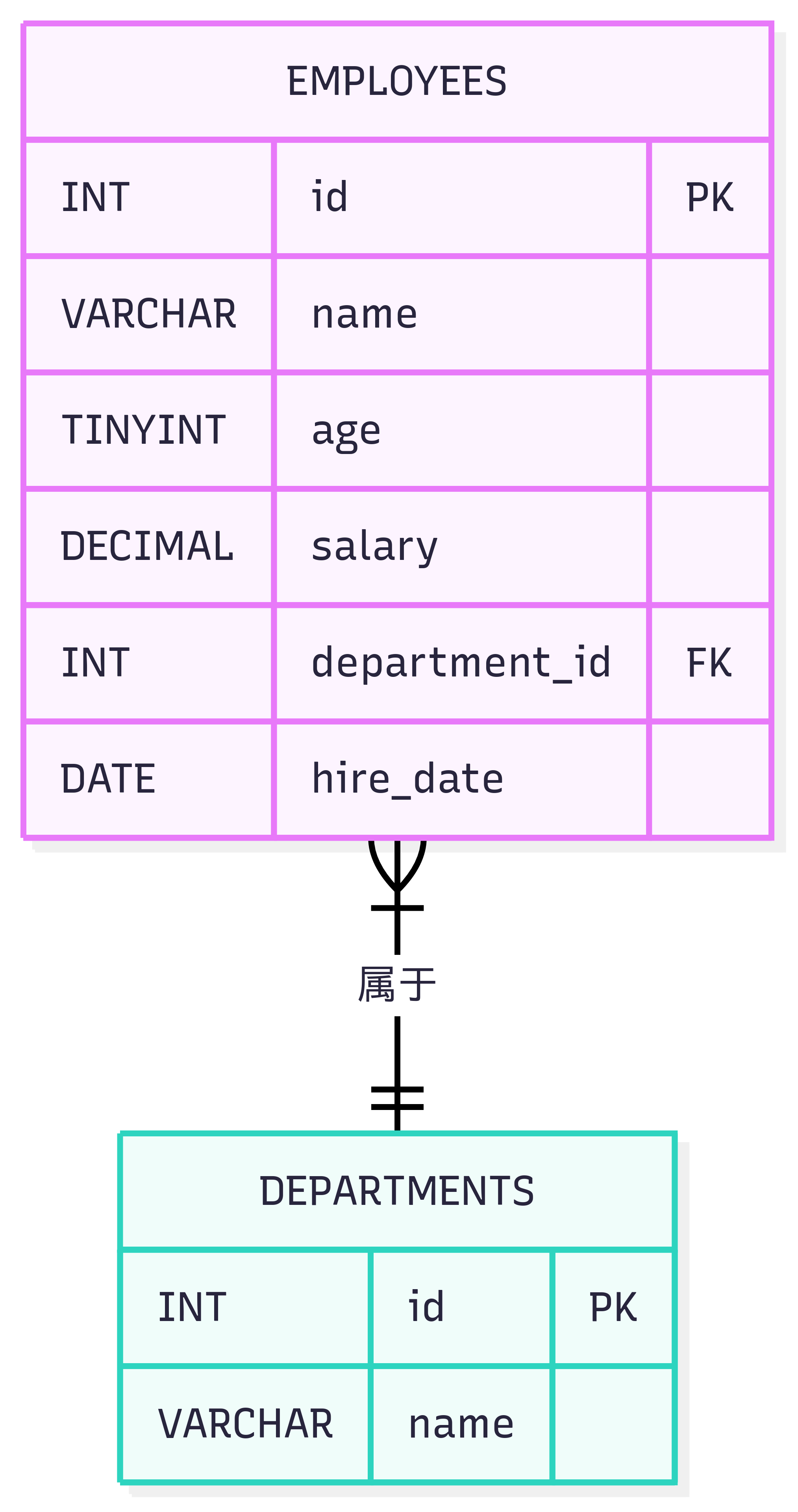 ON DELETE SET NULL -- 部门删除时,员工的部门ID设为NULL