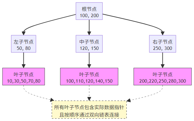 B-Tree 索引通过分层结构实现快速查找,适合范围查询: