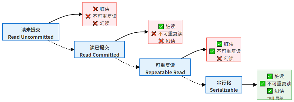 MySQL 默认隔离级别为REPEATABLE READ,不同级别解决的问题不同: