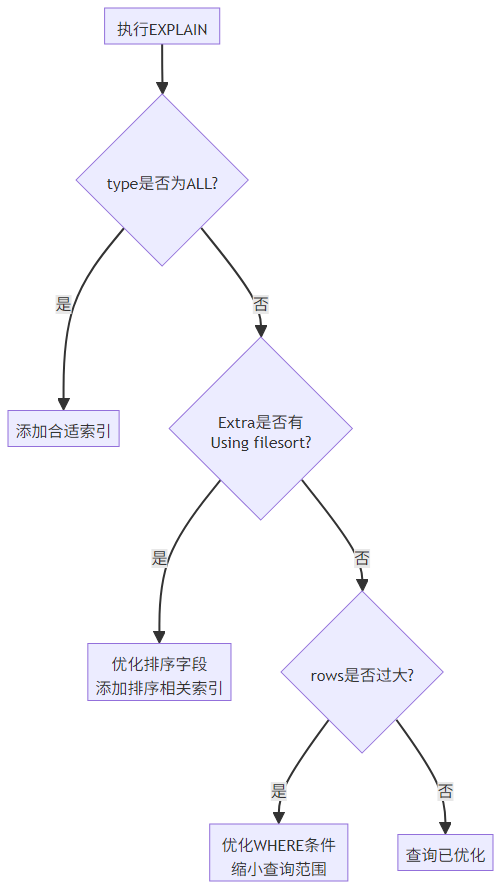 EXPLAIN 是优化查询的核心工具,通过分析执行计划判断是否使用索引: