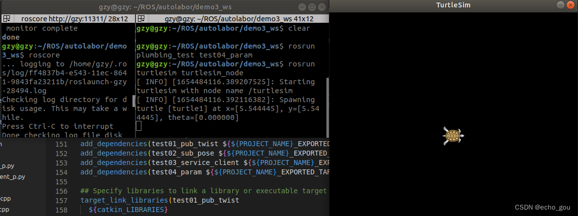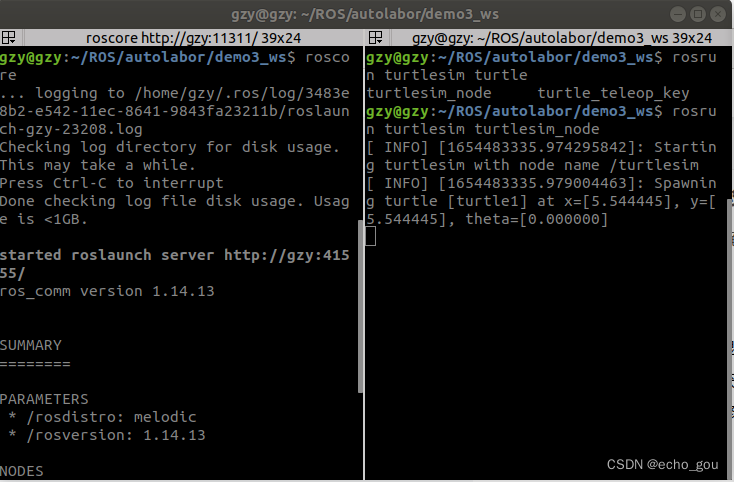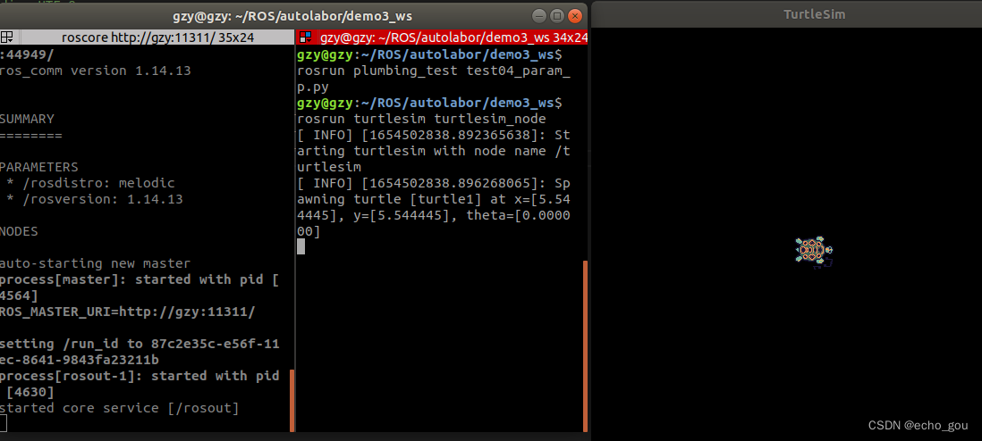 启动roscore 和乌龟节点(注意这里不能使用launch文件来启动,因为我们要去修改的参数数保存在roscore中的,如果使用roslaunch,每次使用的时候roscore都会重启,这样之前改变的参数就重置了)