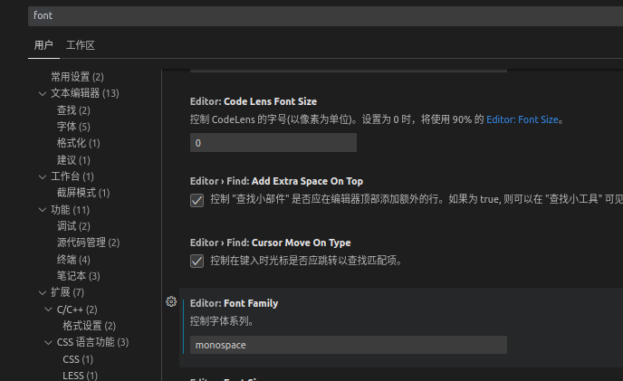 输入font,点击功能-终端,找到如下位置,输入monospace即可。