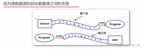 对于输出流而言,目标数据源就是目的地(dest),我们通过流(A Stream)将程序(Program)中的数据(information)输送到目的数据源(dest)中。