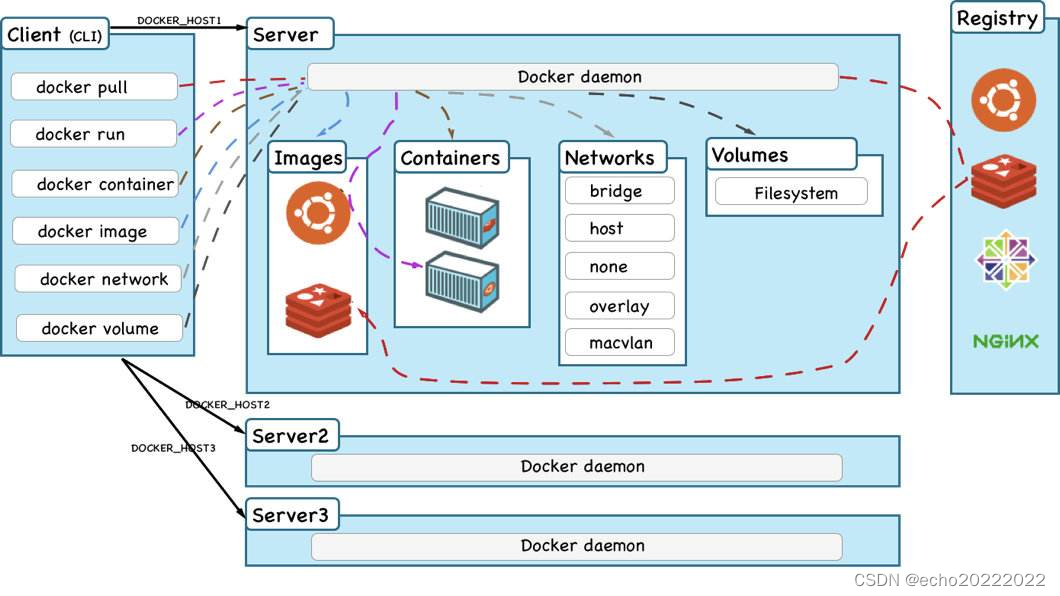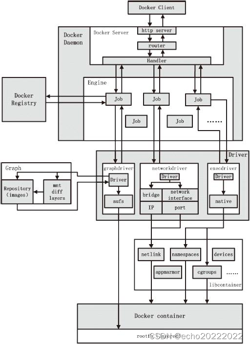 但实际上docker内部的结构要更加复杂,下面是docker的详细的内部机构