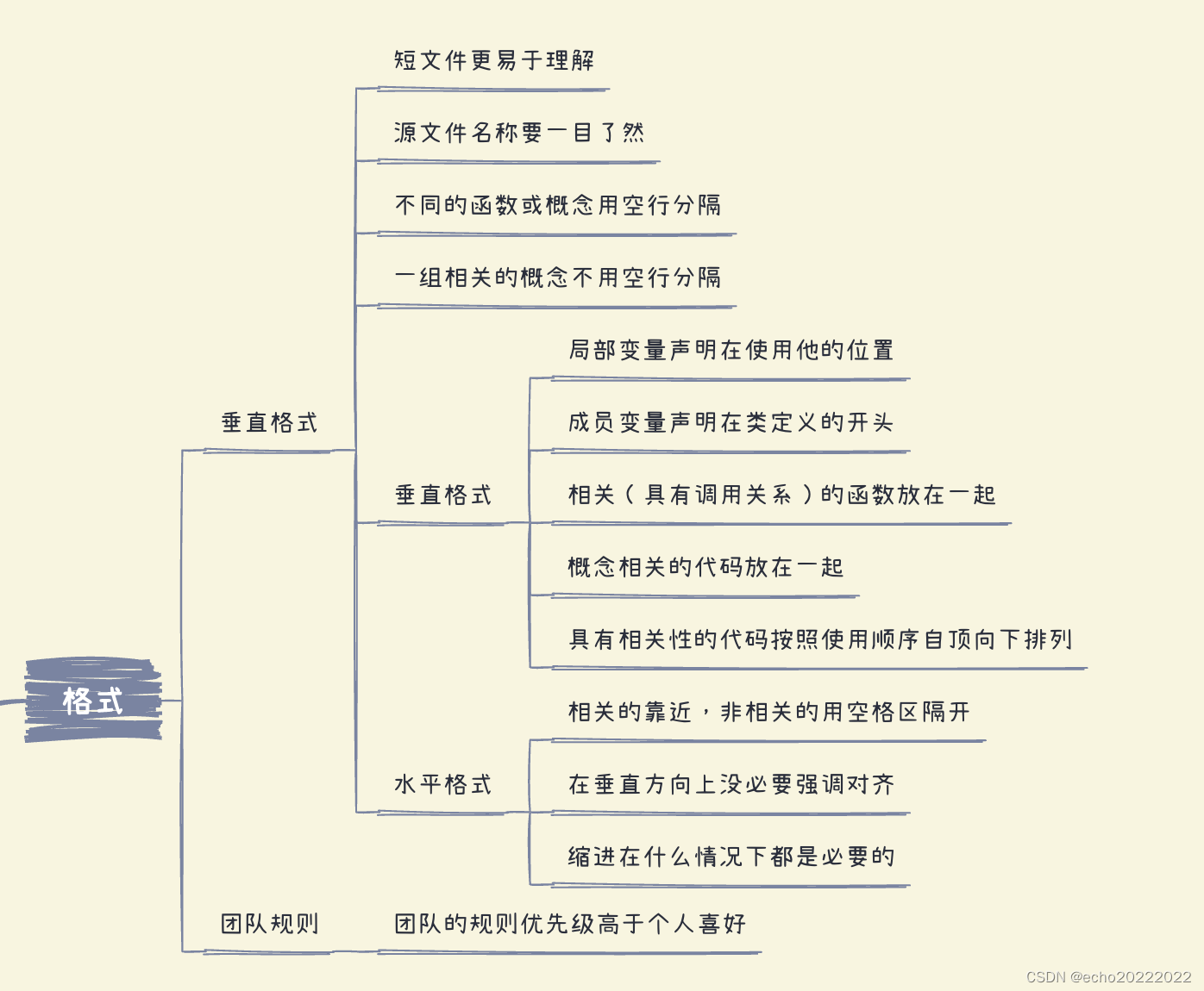 | 垂直距离: 1. 局部变量声明在使用他的位置 2. 成员变量声明在类定义的开头 3. 相关(具有调用关系)的函数放在一起 4. 概念相关的代码放在一起 5. 具有相关性的代码按照使用顺序自顶向下排列 | |