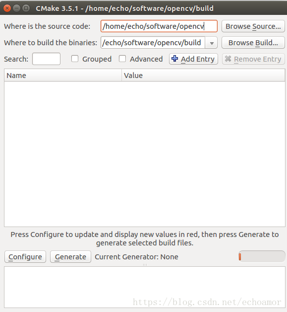 确定路径没问题之后点击configure选择Unix Makefiles,其余默认,点击finish。需要下载一些文件,要等待一段时间。然后CMake即载入默认配置,如下图所示: