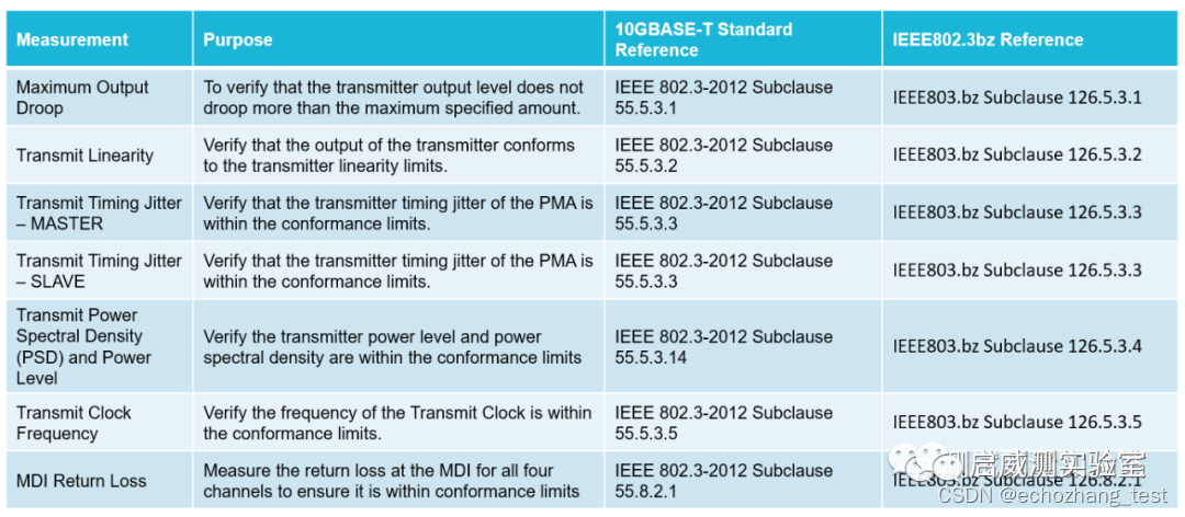 图2 2.5G/5G/10GBase-T测试项目及标准