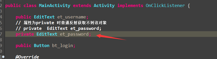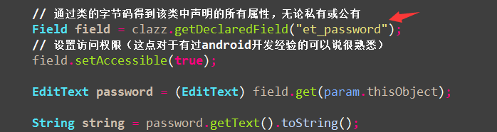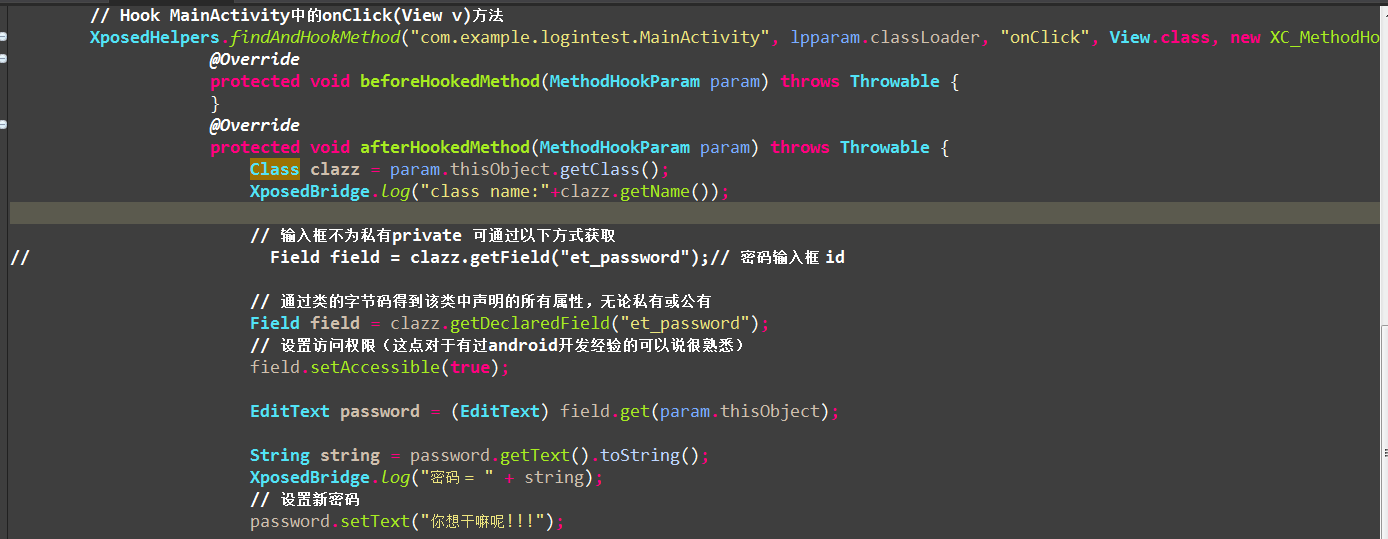 3.如果插件要控制LoginTest的空间,比如控制EditText,那么空间得是public不能是private,不知道为啥(后来用private也没报错了,看网上说getDeclaredField可以反射private对象,但是不知道之前为什么会失败)