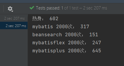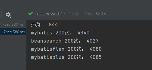 bean-searcher默认在第一次执行某个vo的查询时,会把其属性和数据库字段的映射关系初始化到缓存中去,这就使得bean-searcher在经过一次预热后,性能变得非常优秀,在使用h2内存数据库的情况下进行测试,结果如下图,单位毫秒: