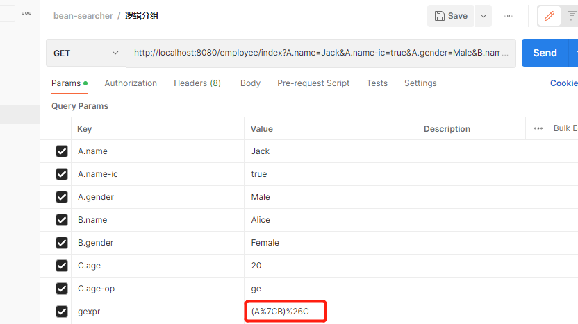 大致思路是将条件进行分组,再使用gexpr针对分组进行逻辑定义,如图,注意"|","&"这种特殊符号在url里面需要转移