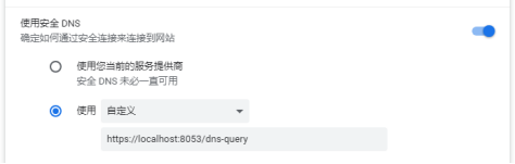 然后在Chrome浏览器安全DNS设置页面(chrome://settings/security)自定义安全DNS的服务地址:https://localhost:8053/dns-query