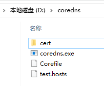 使用coredns搭建本地DNS服务比较简单,将下载到的coredns解压放到某个目录下,例如D:\coredns目录下,将上面生成的localhost.crt和localhost.key放到D:\coredns\cert目录下,自定义的域名写入到D:\coredns\tests.host文件中(文件名自定义),最后创建coredns的配置文件D:\coredns\Corefile,如下图所示: