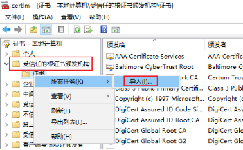 2.选择受信任的根证书颁发机构->证书,然后右击选择所有任务的导入: