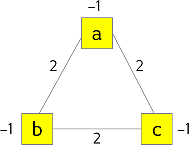 QUBO 能量函数能用三角图表示如图6.2。每个二值变量都是一个带有线性系数的 bias 节点。每个二次项都变成节点之间的一条 edge。