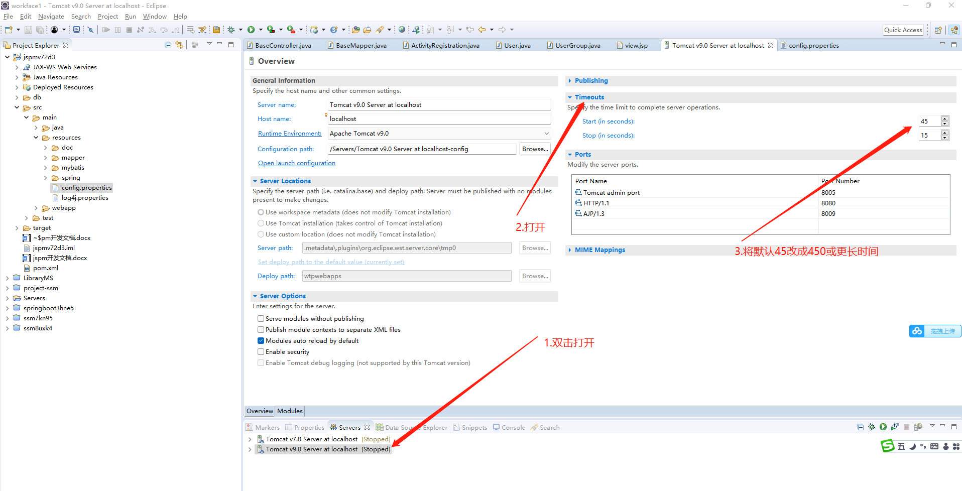 tomcat默认设置运行时间最大为45秒,超过时间就会报错,需要我们自己手动修改一下配置,把时间调大。