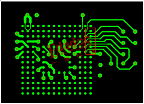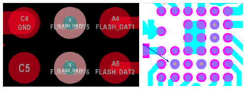 优化后的效果图,将外层的线路移到内层去,BGA PAD上打盘中孔,因为板内其它地方也有盘中孔,也不在乎多这几个盘中孔,生产的良率上升很多,成本降低。