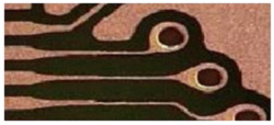 有盘中孔设计的PCB,外层原稿设计线宽线距建议3.5/3.5mil(min)(因为有两次电镀)。