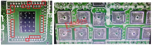 但是做了盘中孔设计,就要做POFV工艺,如果不做此工艺,生产就会有很多问题,比如说PCBA焊接装配,下图的焊接良率就无法保证。