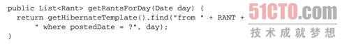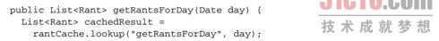 从表面上看,缓存似乎相当简单:在获取一些信息之后,把它保存到本地(和更便于访问的)位置,从而便于下次需要时使用。但是,手工实现缓存是很麻烦的。以HibernateRantDao的getRantsForDay()方法为例: