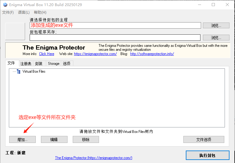- 打开Enigma Virtual Box,选择exe文件,并添加上面的文件夹。