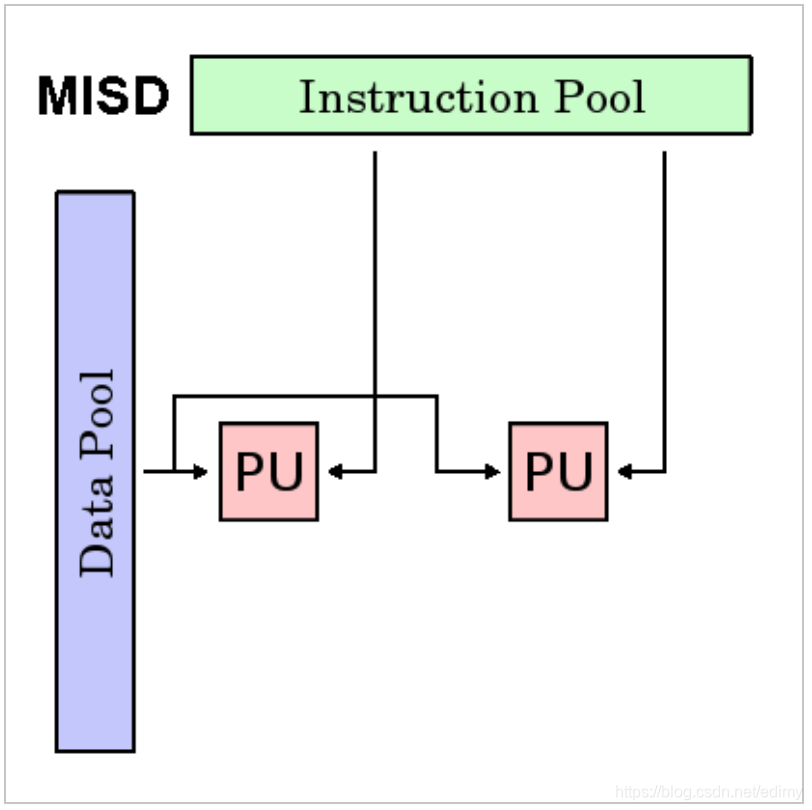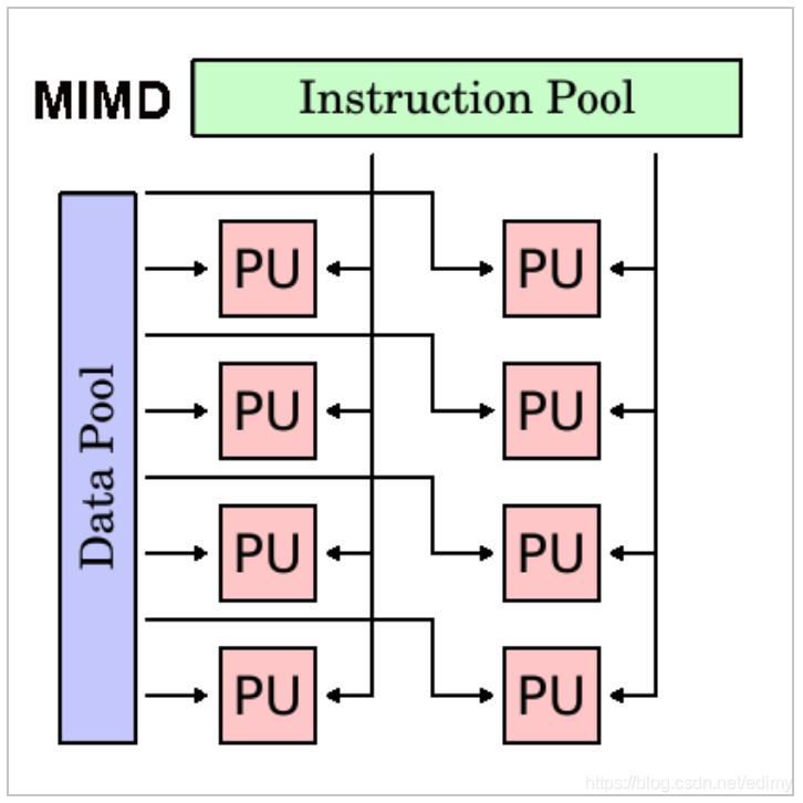 - 多指令:每个处理单元通过单独的指令流独立地对数据进行操作。