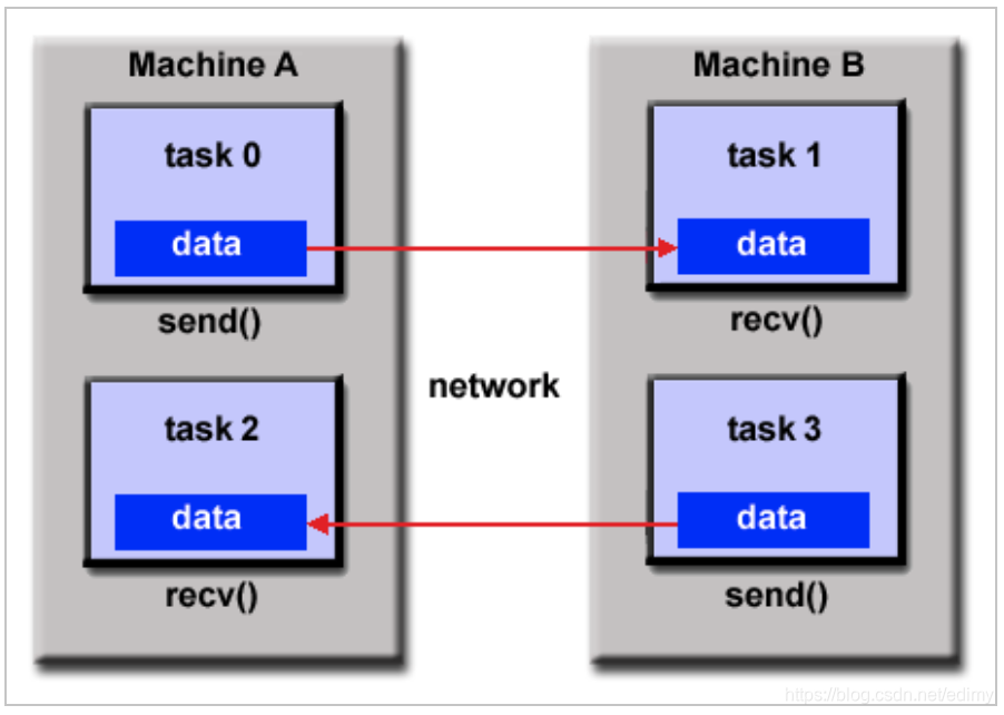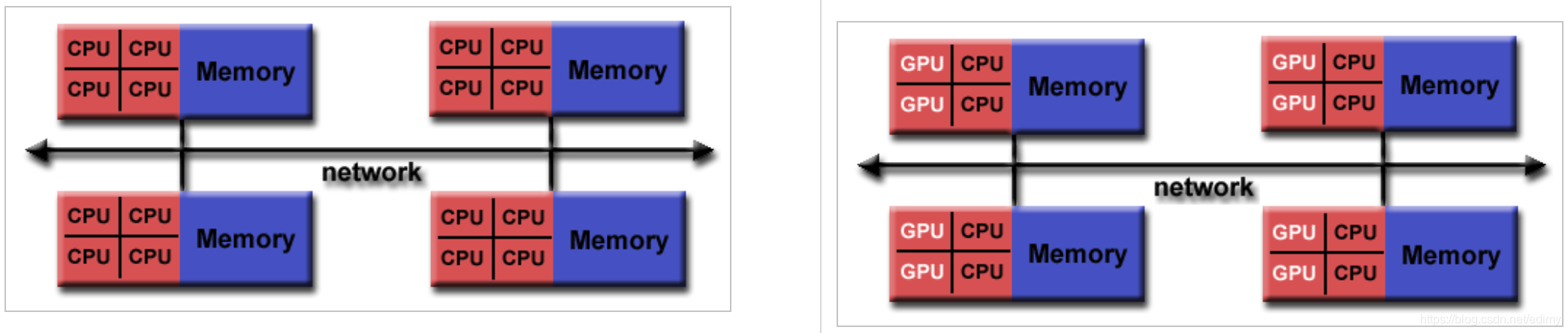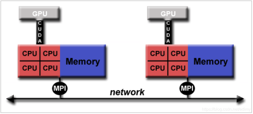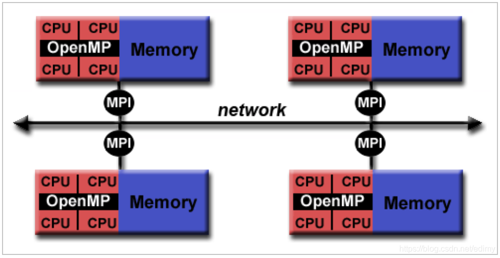 - MPI任务使用本地内存在CPU上运行,并通过网络相互通信。