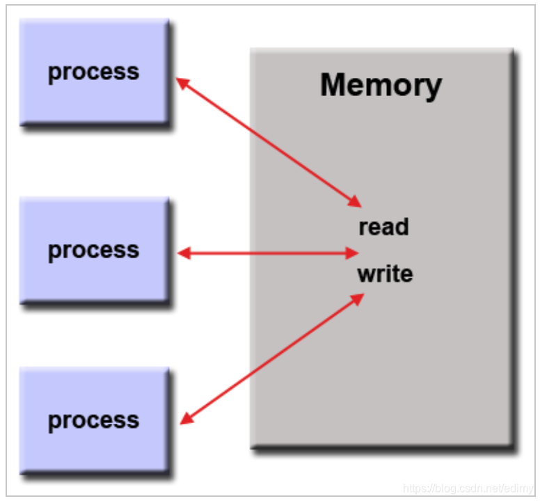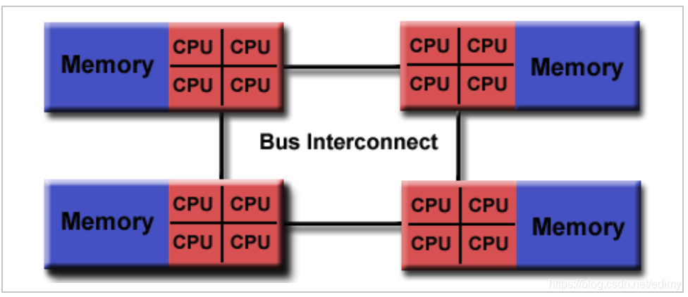 - 共享内存 Shared Memory:从硬件角度出发,描述了一种计算机体系结构,其中所有处理器都可以直接(通常基于总线)访问公共物理内存。从编程的角度讲,它描述了一个模型,其中并行任务都具有相同的“图片”内存,并且可以直接寻址和访问相同的逻辑内存位置,而不管物理内存实际存在于何处。