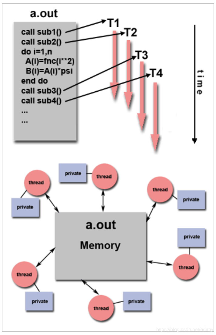 - a.out执行一些串行的工作,同时创建一些能够被操作系统调用的任务(线程)