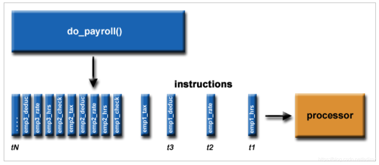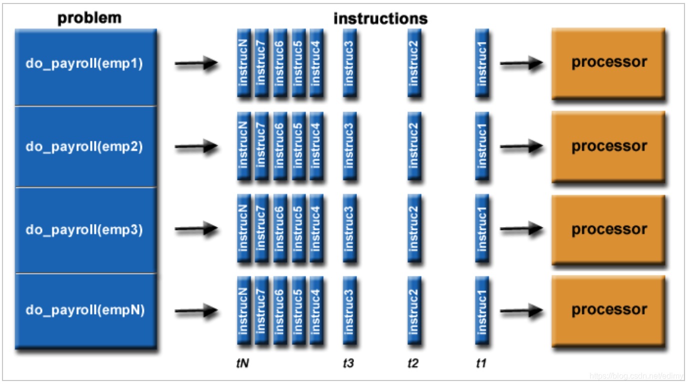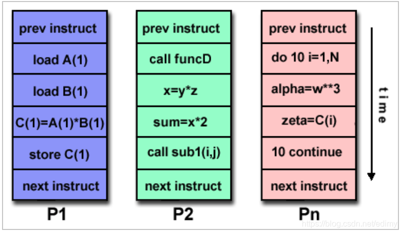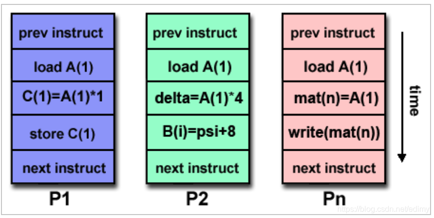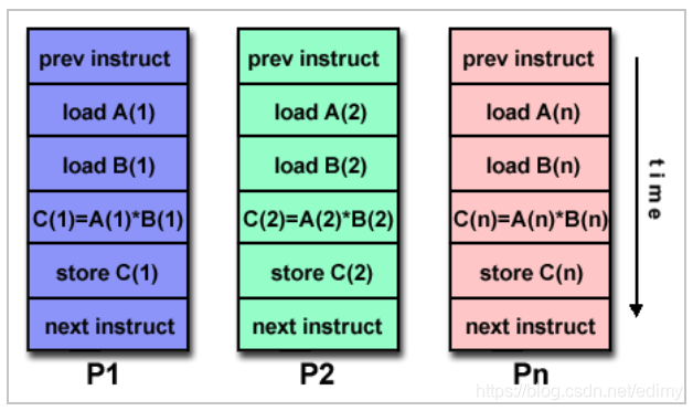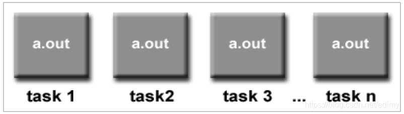- 单个程序:所有任务同时执行同一程序的副本。该程序可以是线程,消息传递,并行数据或混合数据。
