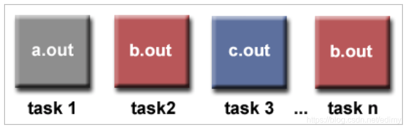 - 多个程序:任务可以同时执行不同的程序。程序可以是线程,消息传递,并行数据或混合数据。