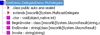 .class public auto ansi sealed EmitDemo.DelegateDemo.MyDelegate extends [mscorlib]System.MulticastDelegate { } // end of class EmitDemo.DelegateDemo.MyDelegate .method public hidebysig specialname rtspecialname instance void .ctor(object 'object', native int 'method') runtime managed { } // end of method MyDelegate::.ctor .method public hidebysig newslot virtual instance string Invoke(string message) runtime managed { } // end of method MyDelegate::Invoke
