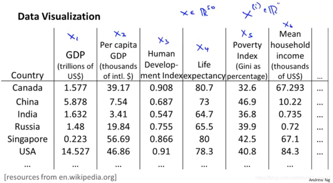 (mean household income) etc. And we may have a huge data set like this, maybe 50 features for every country,