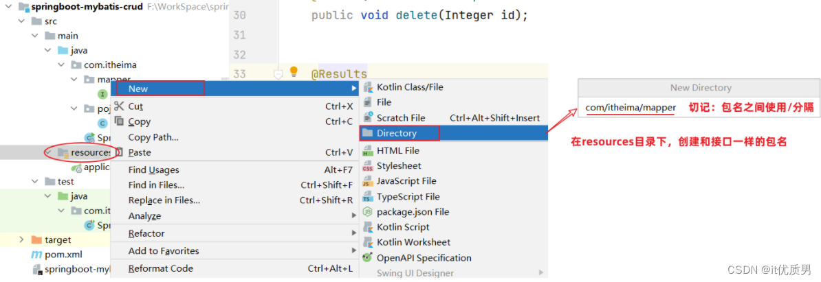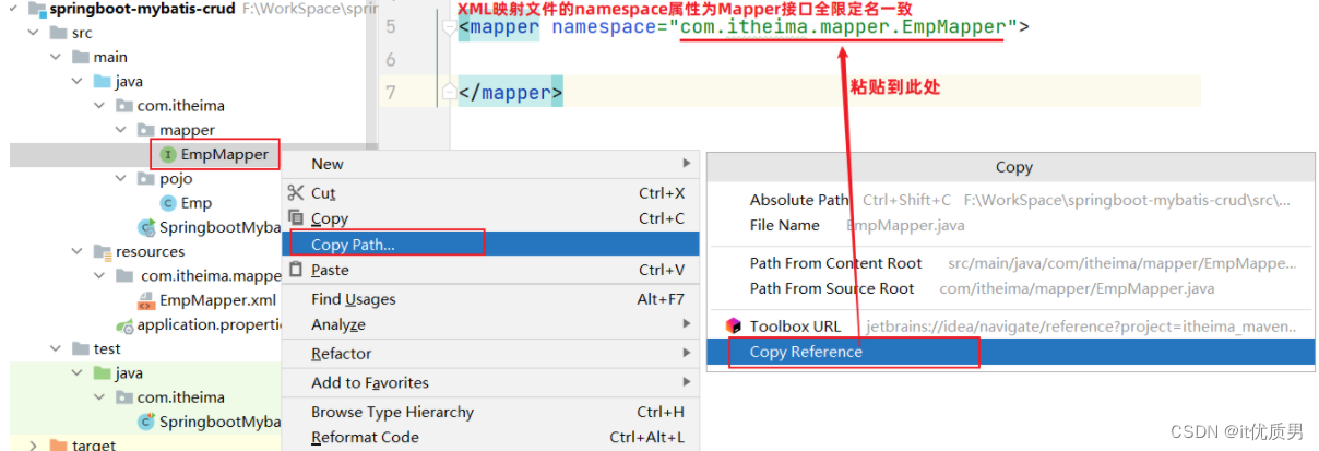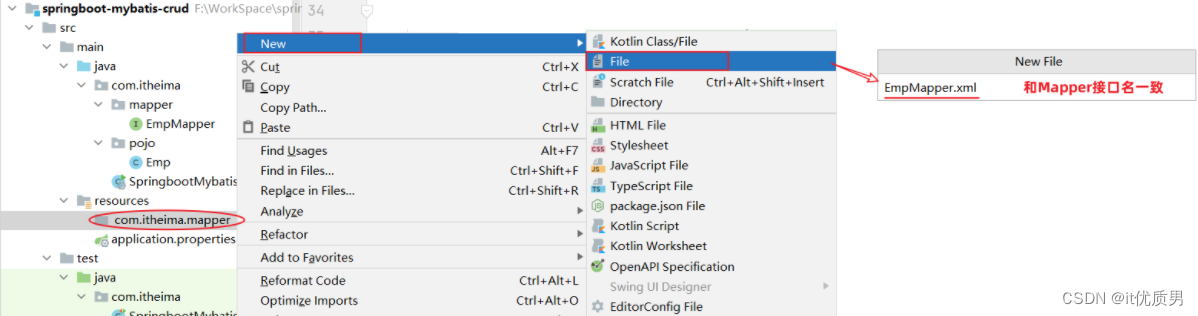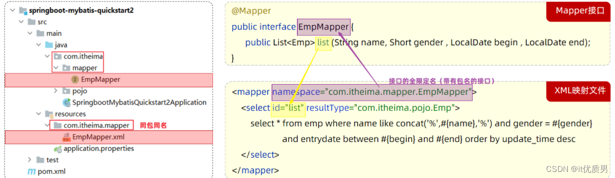 XML映射文件的名称与Mapper接口名称一致,并且将XML映射文件和Mapper接口放置在相同包下(同包同名)
