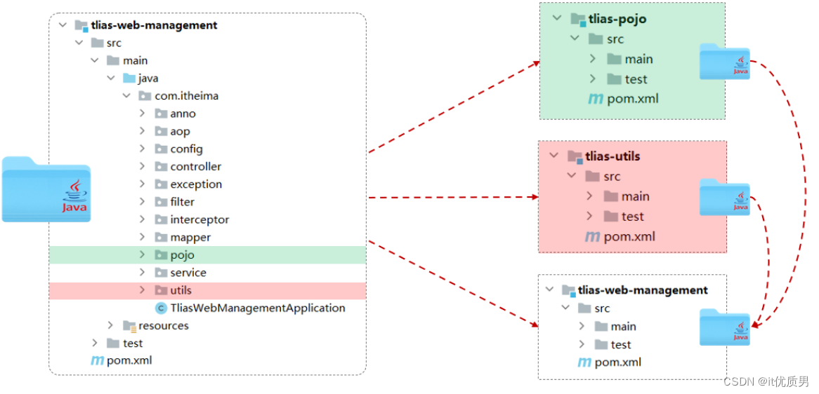 到此呢,已经完成了模块的拆分,拆分出了 tlias-pojo、tlias-utils、tlias-web-management ,如果其他项目中需要用到 pojo,或者 utils工具类,就可以直接引入依赖。