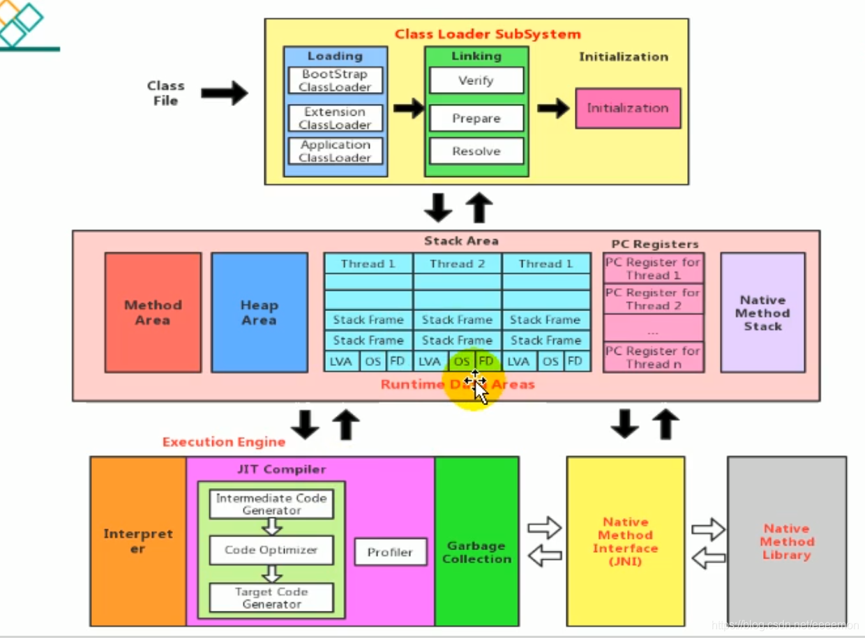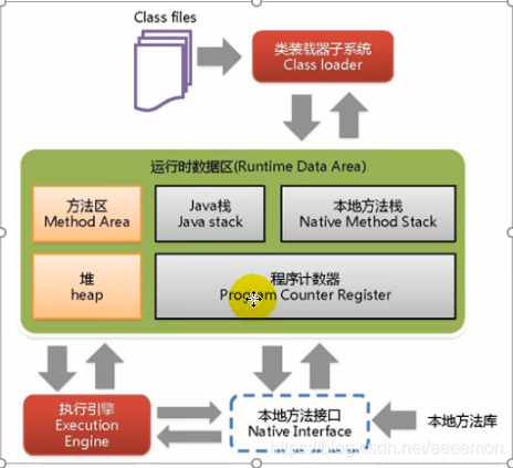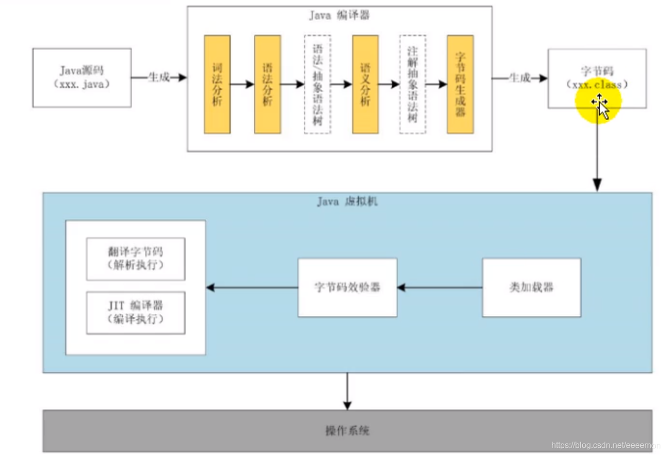 - 执行引擎:包含三部分:解释器,及时编译器(后端编译器),垃圾回收器