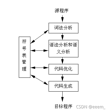 编译程序的职能是把使用某程序设计语言书写的程序翻译为等价的机器语言程序,所谓等价是指目标程序执行源程序的任何预定功能。一般来说,编译程序分为以下几个部分:词法分析、语法分析和语义分析、代码优化、代码生成和符号表管理。