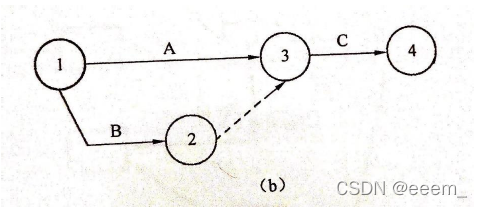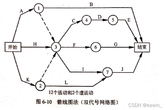为了绘图的方便,在箭线图中又认为引入了一种额外的、特殊的活动,叫做虚活动,在网络图中用一个虚箭线表示,虚活动不消耗事件和资源,只为了弥补箭线图在表达依赖关系方面的不足。借助虚活动,可以更好地、更清楚地表达活动之间的关系。