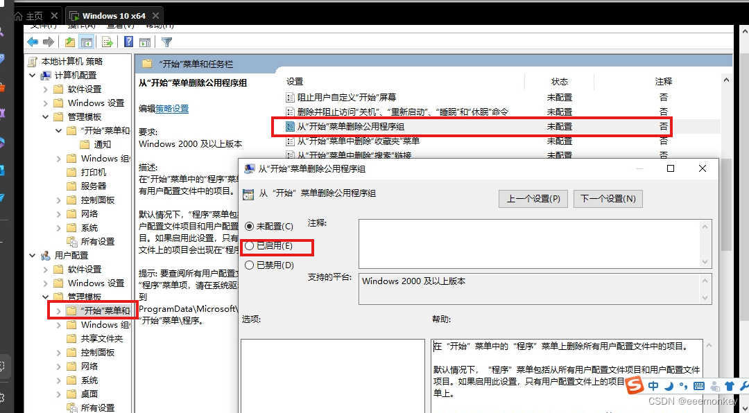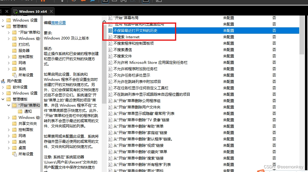用户配置~开始菜单和任务栏~双击不保留最近打开文档的历史~启用~确定