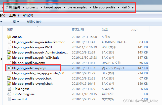 打开BLE透传实验的Keil工程文件ble_app_profile.uvproj,位于目录: