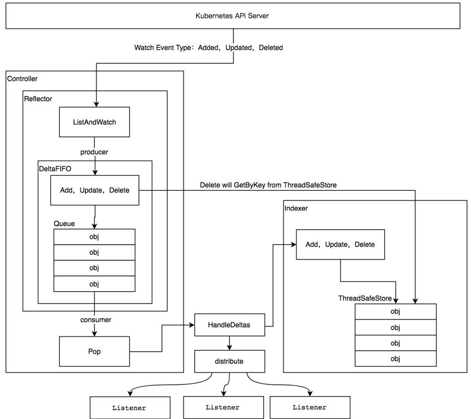 Reflector用于监控(Watch)指定的Kubernetes资源,当监控的资源发生变化时,触发相应的变更事件,例如Added(资源添加)事件、Updated(资源更新)事件、Deleted(资源删除)事件,并将其资源对象存放到本地缓存DeltaFIFO中。