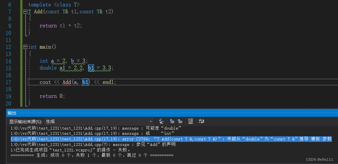 //b1是double类型,a是int类型,而模板参数只有一个T,不能够直接的将a、b作为实参传递