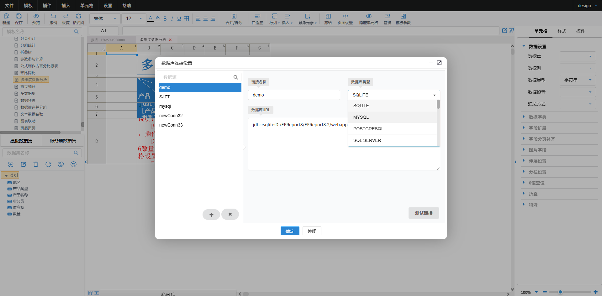 盈帆报表的一大优势是其强大的多数据源整合能力。系统支持SQLITE、MYSQL、POSTGRESQL、SQL SERVER、ORACLE、SYBASE、DB2、INFORMIX、ODBC、IGNITE等关系型数据库,同时也兼容达梦、人大金仓等国产数据库,可链接Redis、Mongodb、HIVE等非关系型数据库。