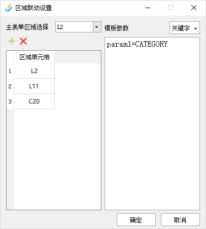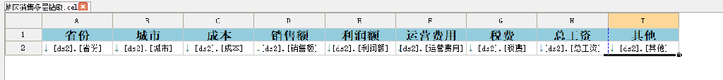 添加数据源,在数据集获取语句窗口中输入:“select *,'' as a from 城市销量”, 加入数据源ds1。再添加一个数据源ds2:“select * from 城市销量 where 省份 like '%'||@{param1}||'%'”。param1参数设置如下: