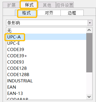 选中[ds1][编码]字段单元格,在右侧设置“样式”中的“格式”中的UPC-A ,效果如下图: